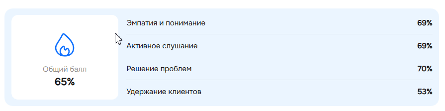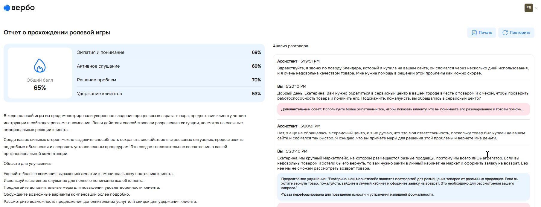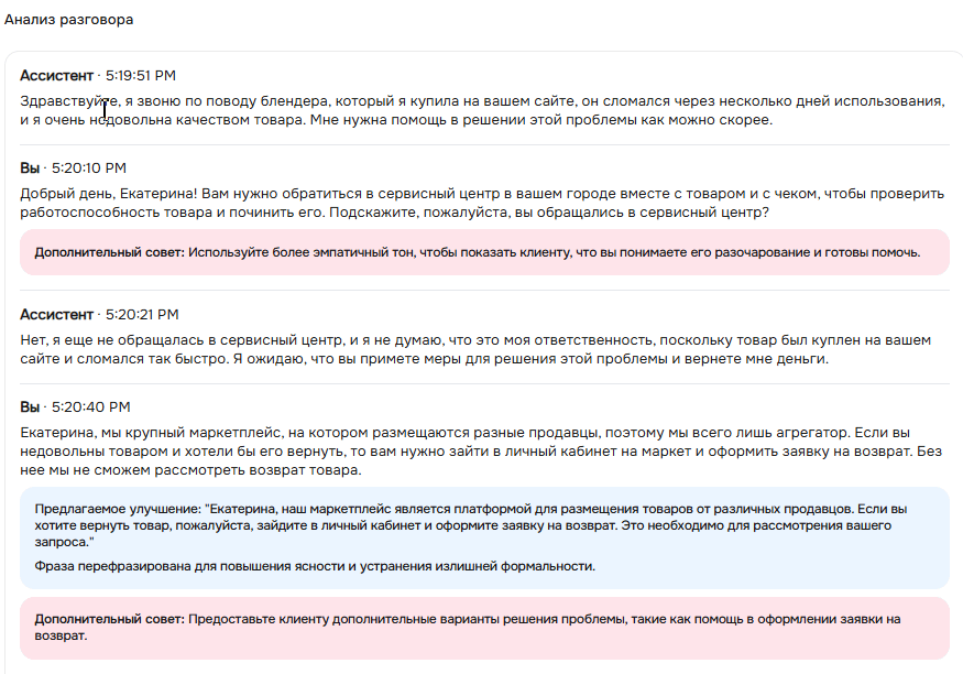 В этом блоке вы увидите весь ваш диалог построчно и подсказки, как можно было бы ответить лучше: