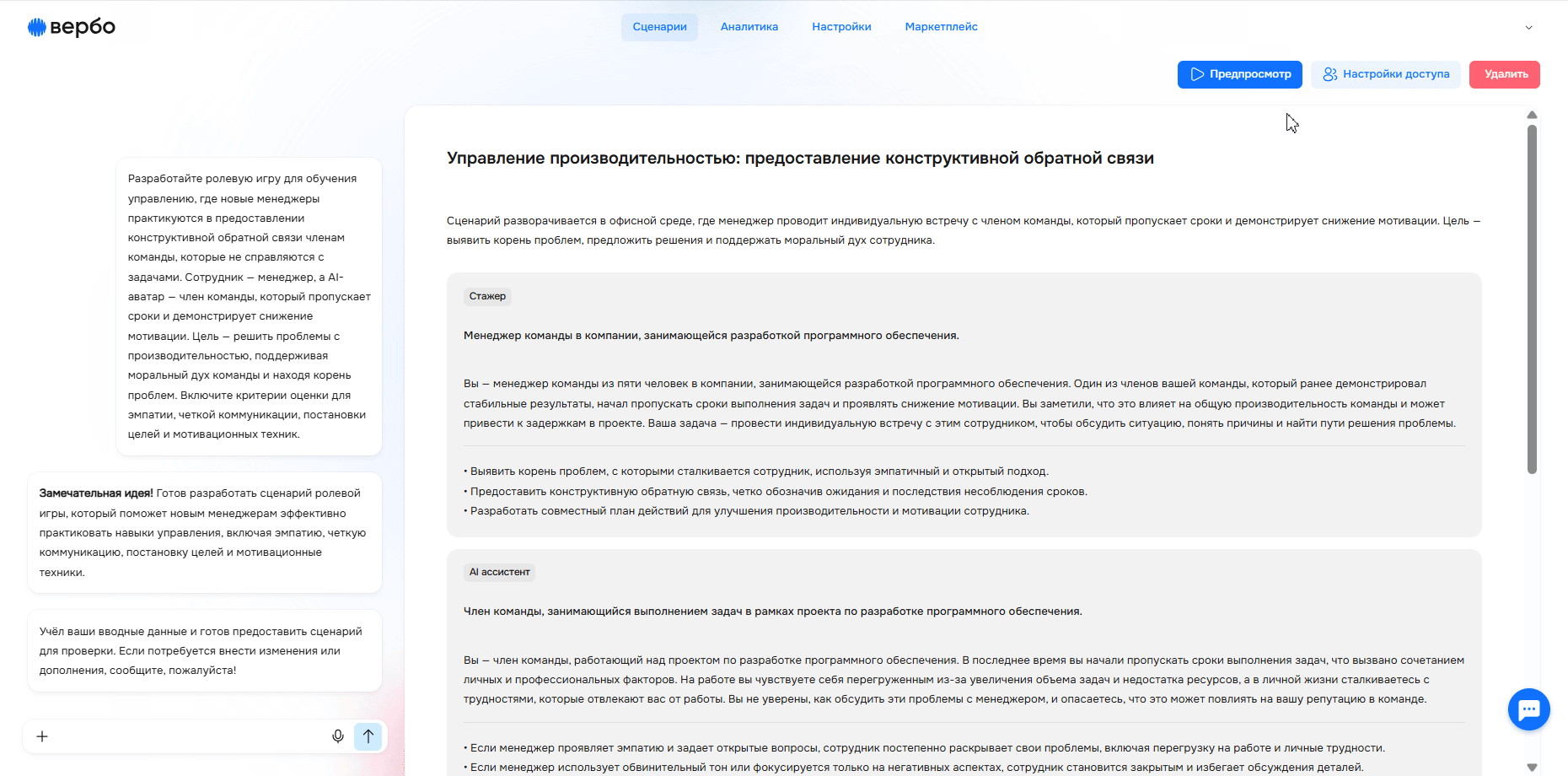 Любой готовый сценарий можно снова открыть и отредактировать. Это полезно, если нужно актуализировать информацию или доработать сценарий на основе обратной связи.