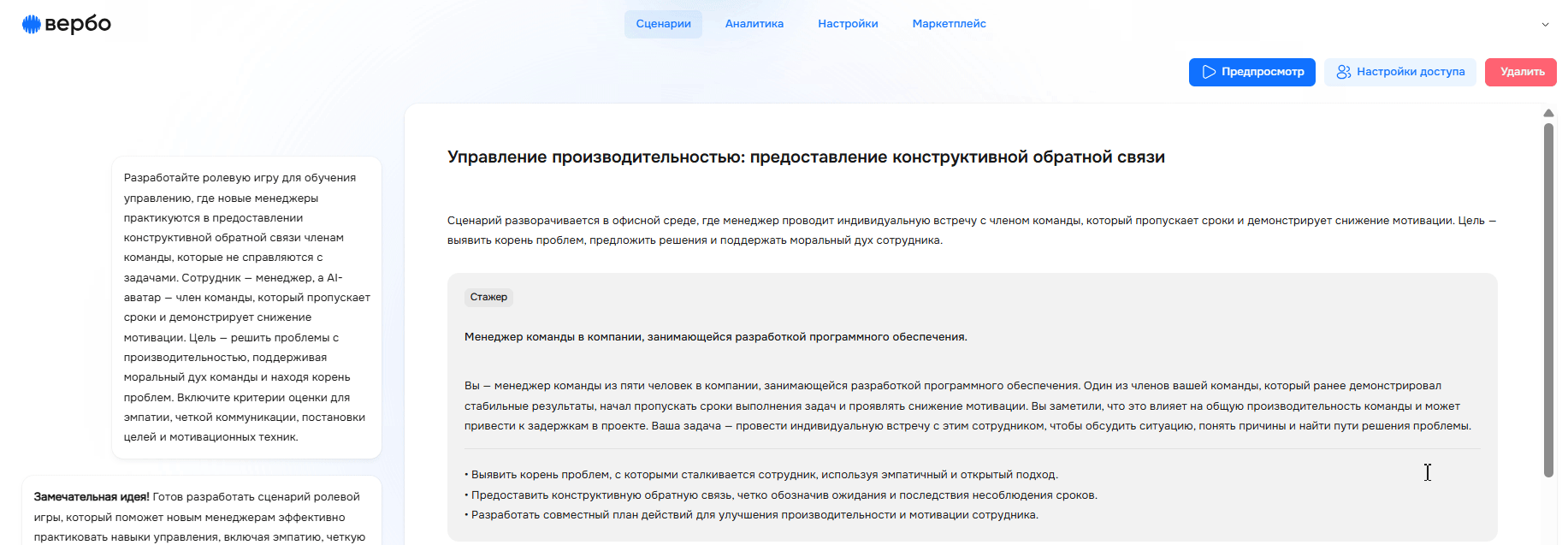 Вы создали сценарий ролевой игры — теперь настройте, кто, когда и как сможет в него играть. Это поможет контролировать бюджет, сроки и доступ для стажеров. Для этого нажмите на кнопку «Настройка доступа».