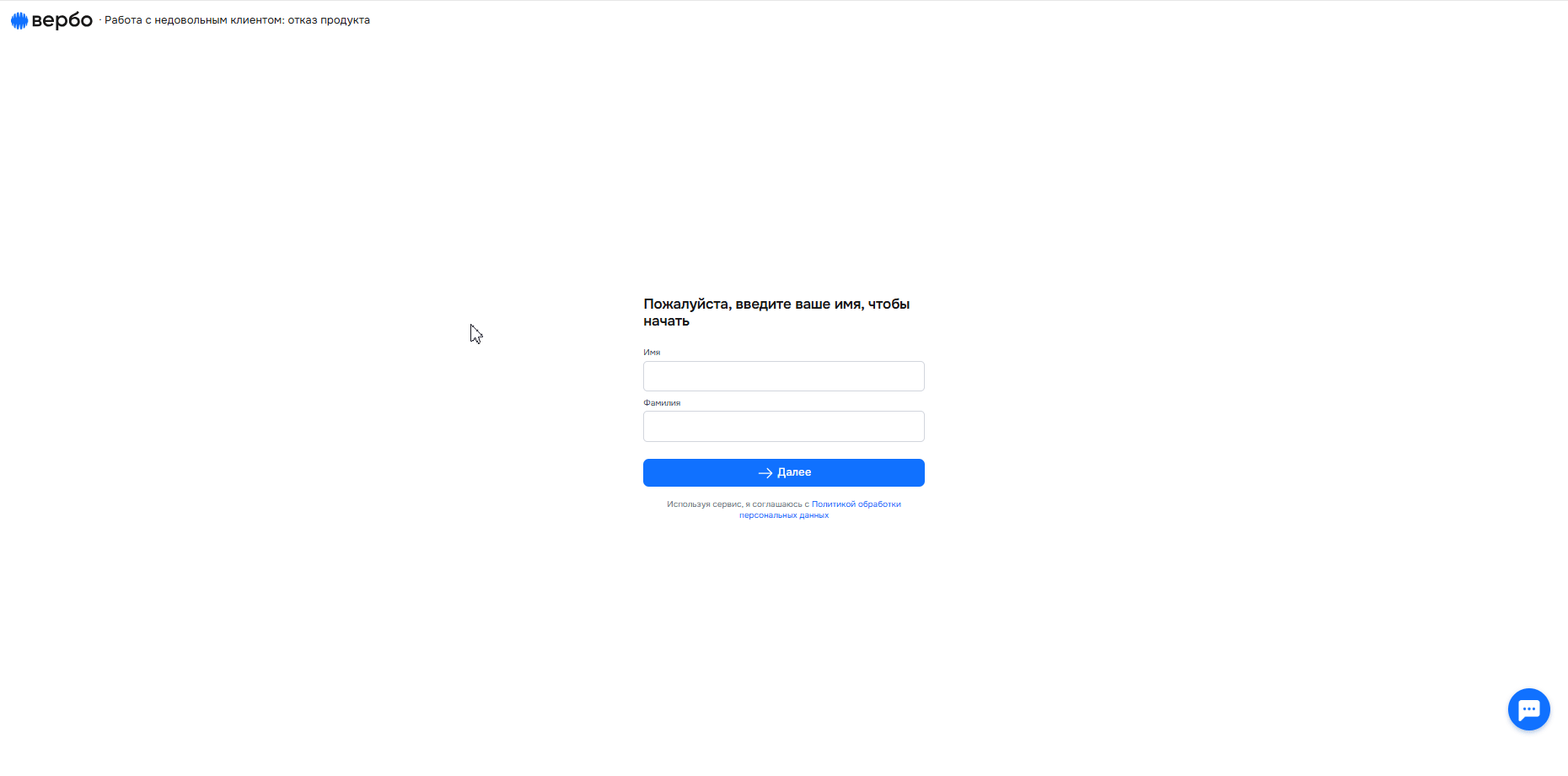 Перед началом вам нужно ввести ваши имя и фамилию — это важно для отслеживания ваших результатов внутри организации. После ввода данных нажмите на кнопку «Далее», чтобы продолжить.