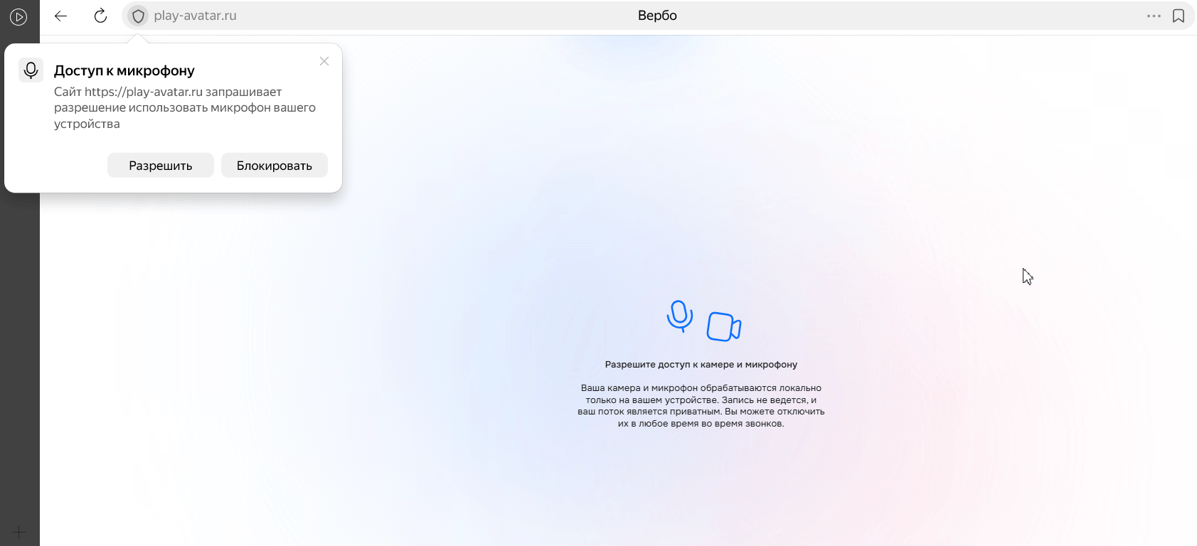 ⚠️ Важно: ваши камера и микрофон обрабатываются локально только на вашем устройстве, запись не ведется, и ваш поток является приватным. Вы можете отключить их в любое время во время разговора.