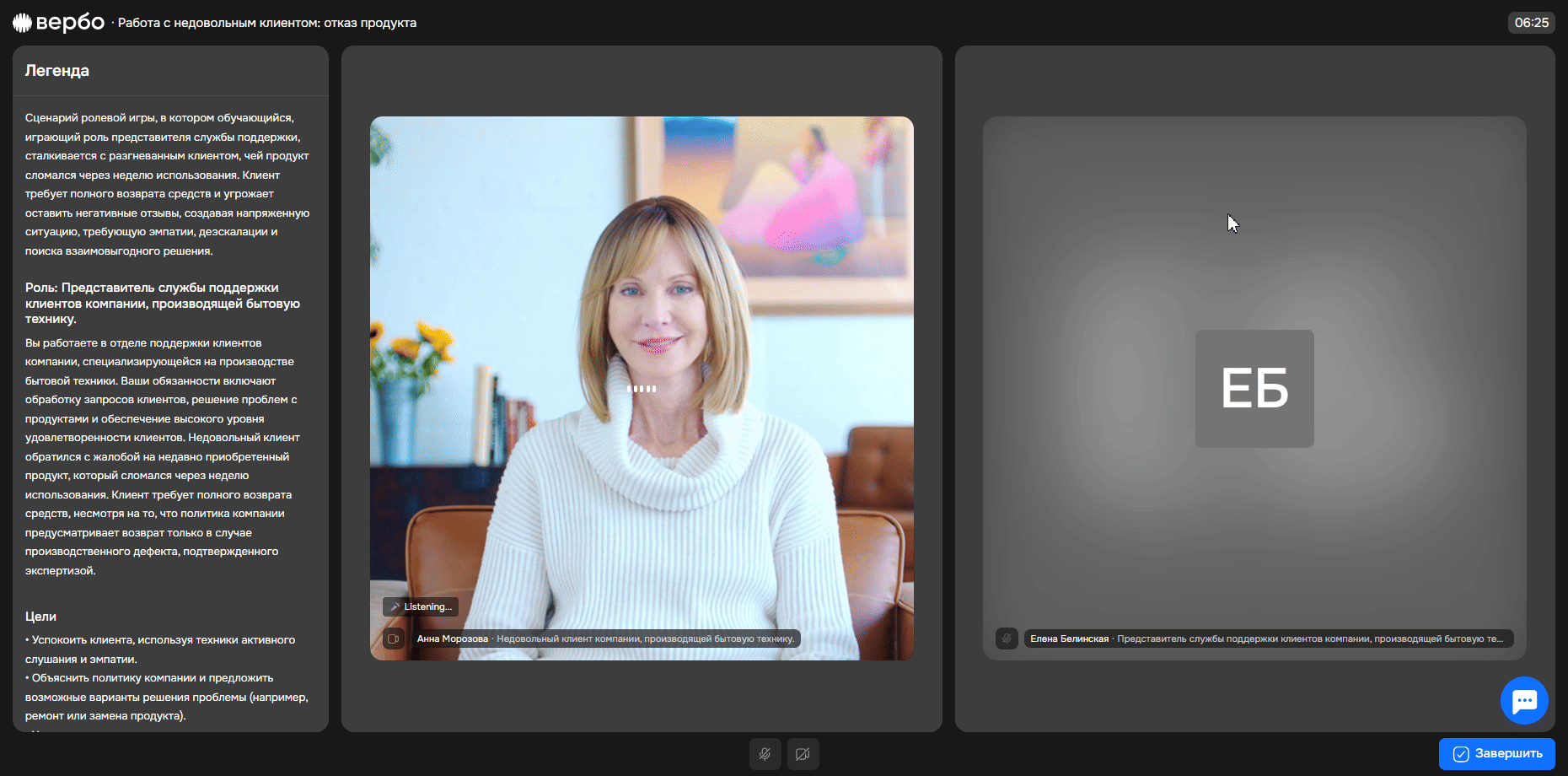 ИИ начнет диалог согласно прописанному сценарию, вам нужно просто продолжить разговор. Внизу экрана можно управлять доступом к микрофону и камере. Под окном с аватаром отображается статус «Слушает» или «Говорит» — он показывает, слушает ли аватар вас сейчас или озвучивает свою реплику.
