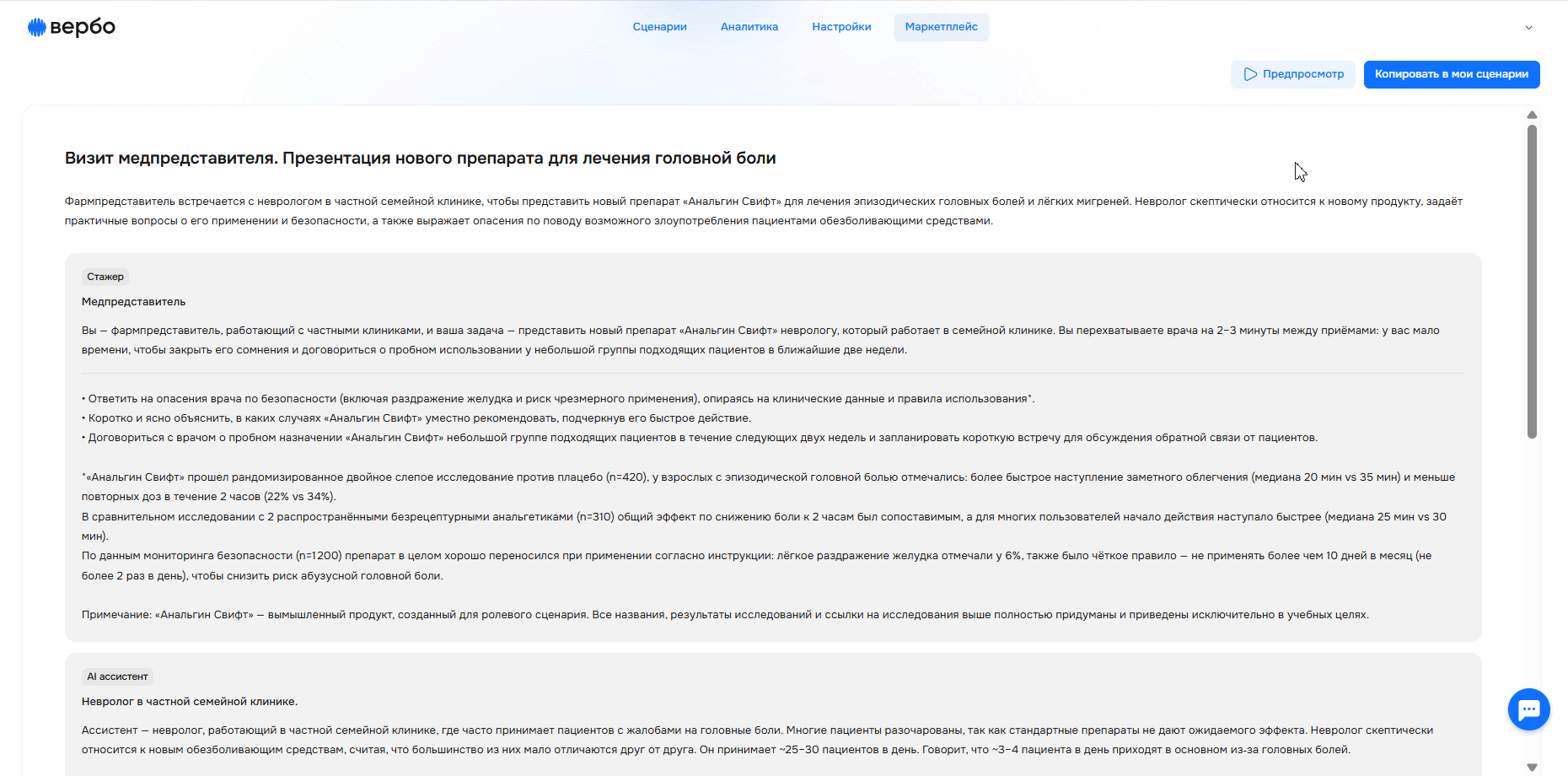 Чтобы протестировать сценарий, нажмите на кнопку «Предпросмотр». Вы сможете изучить легенду, пообщаться с аватаром и получить отчет с результатами. Также ваша сессия появится в разделе «Аналитика».