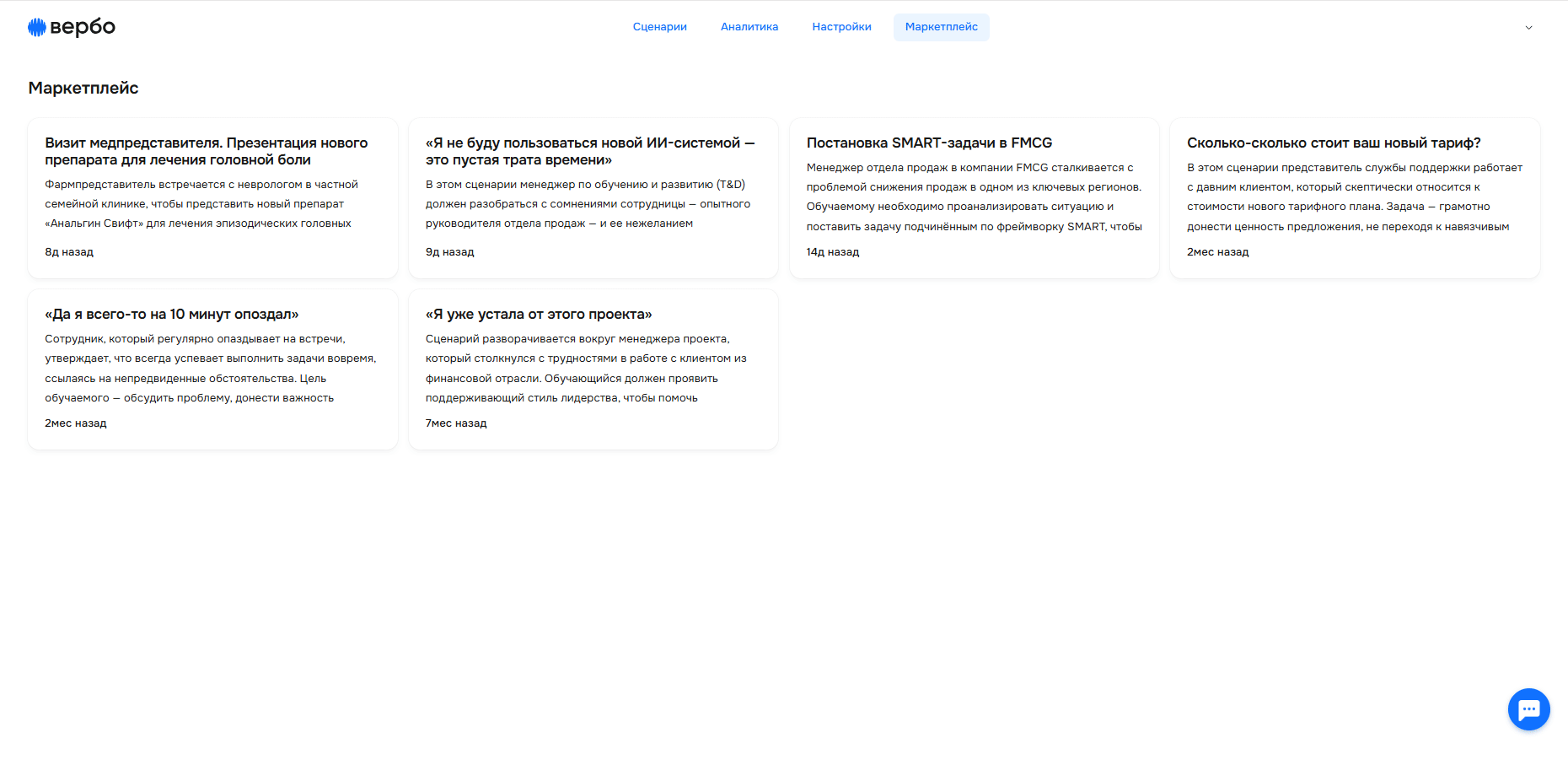 📚 Маркетплейс — это доступная вам библиотека готовых сценариев. Используйте их, чтобы быстро запускать ролевые игры для обучения сотрудников, не создавая все с нуля.