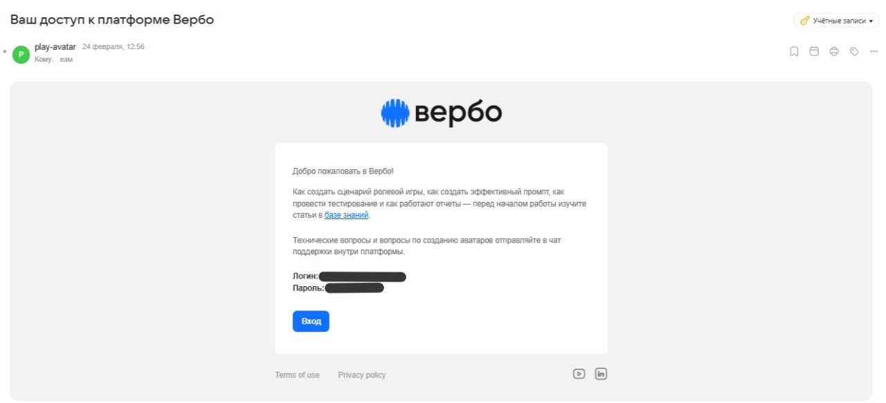 Письмо приходит с адреса play-avatar. Внутри него будет: ссылка для входа, ваш логин (почта) и временный пароль.